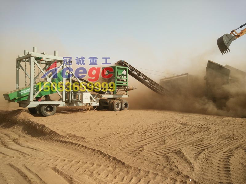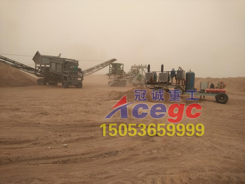 冠誠重工新型旱地選金設(shè)備也叫干選風(fēng)選金礦設(shè)備,適用于干旱,缺水,沙漠等風(fēng)力資源豐富的地區(qū),該款為移動車載式沙金機械,移動方便,適合復(fù)雜地形使用。